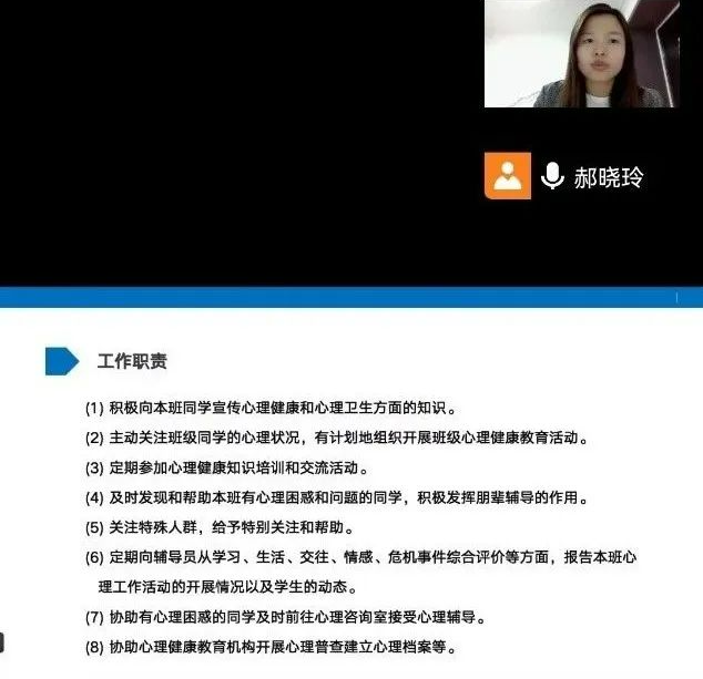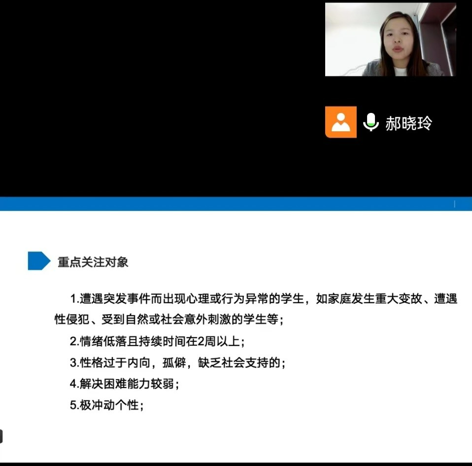作为本次线上培训的重点内容,心理老师在向各参会同学着重讲解的同时,要求大家在日常学习与生活中,多多关注心理存在缺陷或心理受到刺激的同学,在他们遇到困难的时候,及时给予帮助,如果出现异常也要及时地告知老师。