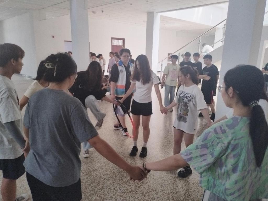 5月21日,阳光明媚的午后,产学研实训中心一楼热闹非凡。同学们分成若干小组,每组成员手拉手围成一个封闭的圆圈,随着裁判的一声令下,每个小组都开始了紧张而有趣的“穿越呼啦圈”挑战。只见呼啦圈在同学们的手臂间灵活穿梭,每个人都全神贯注,生怕一不留神就让呼啦圈落地。