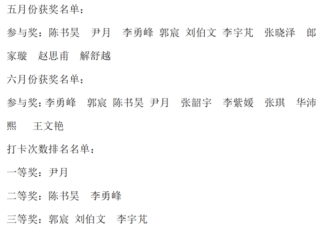 经过长达两个月的打卡活动,共有22名学生参与其中。最后通过工作人员的统计,共有15名学生获得奖项,名单如下: