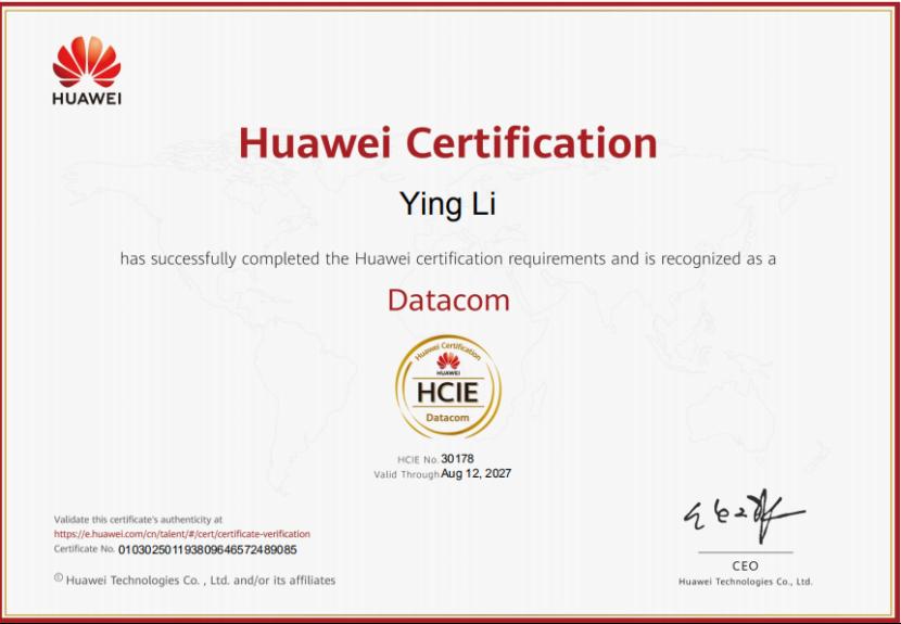 成果12:beat365英国官网信息管理专业大四学生李盈通过HCIE证书