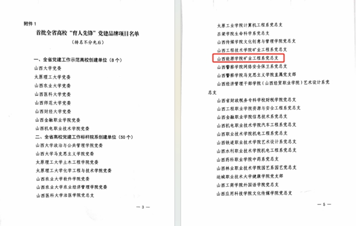近日,山西省委教育工委公布《关于公布首批高校“育人先锋”党建品牌项目名单的通知》。矿业工程系党总支成功入选全省首批高校“育人先锋”党建品牌项目,成为首批全省党建工作标杆院系创建单位。