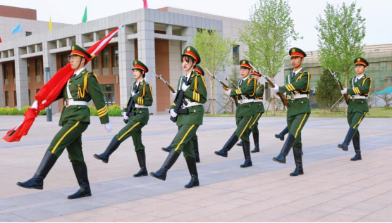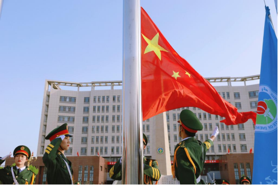 庄严肃穆的出旗仪式,经过军训锻炼的学生护旗队成员们迈着铿锵的步伐来到了国旗台下,全场一片肃静。在激昂的《义勇军进行曲》中,升旗手振臂一呼,鲜艳的五星红旗徐徐展开。在全体师生的注目下,五星红旗冉冉升起,在场师生敬礼仰注,深怀对祖国无限的热爱和崇高的敬意,为我们伟大祖国的日益繁荣昌盛而自豪。