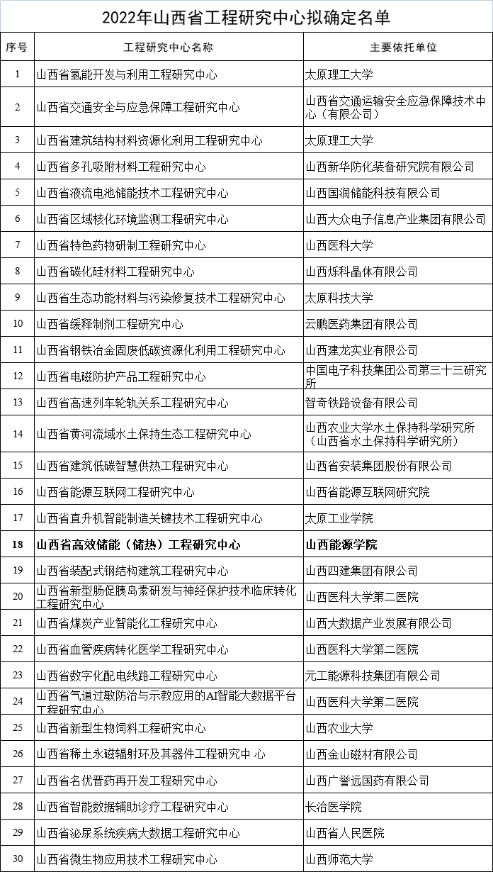 按照《关于组织申报2022年省级工程研究中心的通知》(晋发改高新发〔2022〕41号)有关要求,山西省发展和改革委员会委托第三方机构组织开展了2022年省级工程研究中心评审工作,初步提出了2022年山西省工程研究中心拟确定名单(见附件),现予以公示。其中,我院“山西省高效储能(储热)工程研究中心”入选。