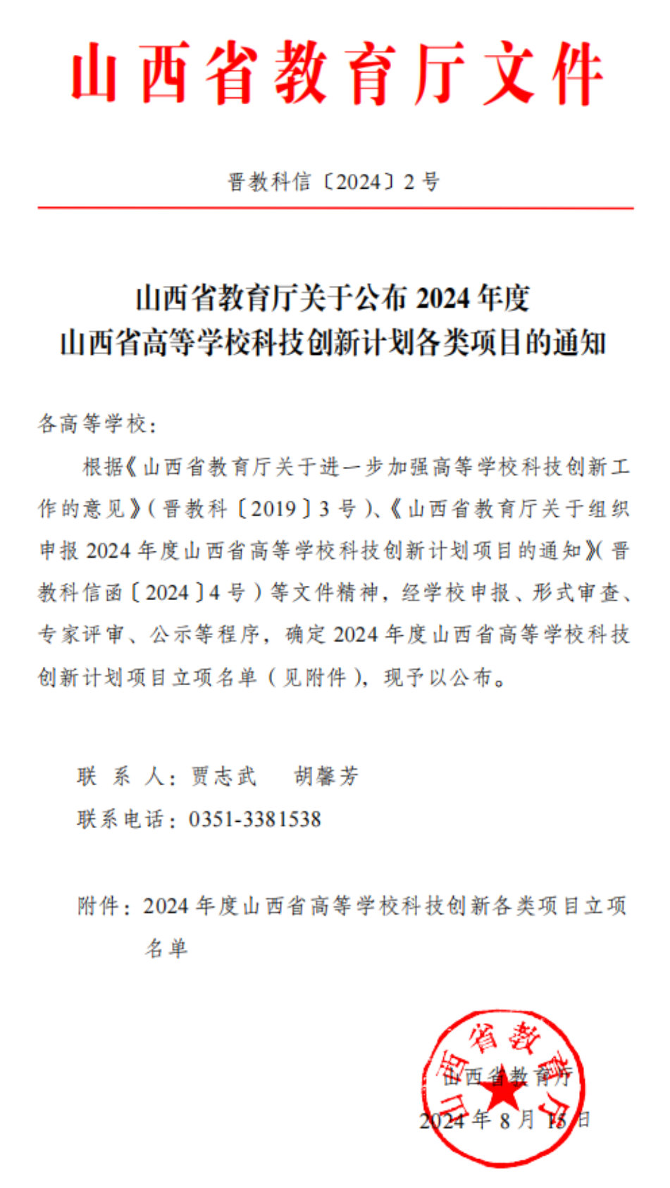 近日,山西省教育厅下发了《山西省教育厅关于公布 2024 年度山西省高等学校科技创新计划各类项目的通知》(晋教科信〔2024〕 2号),我院10个项目获批立项。