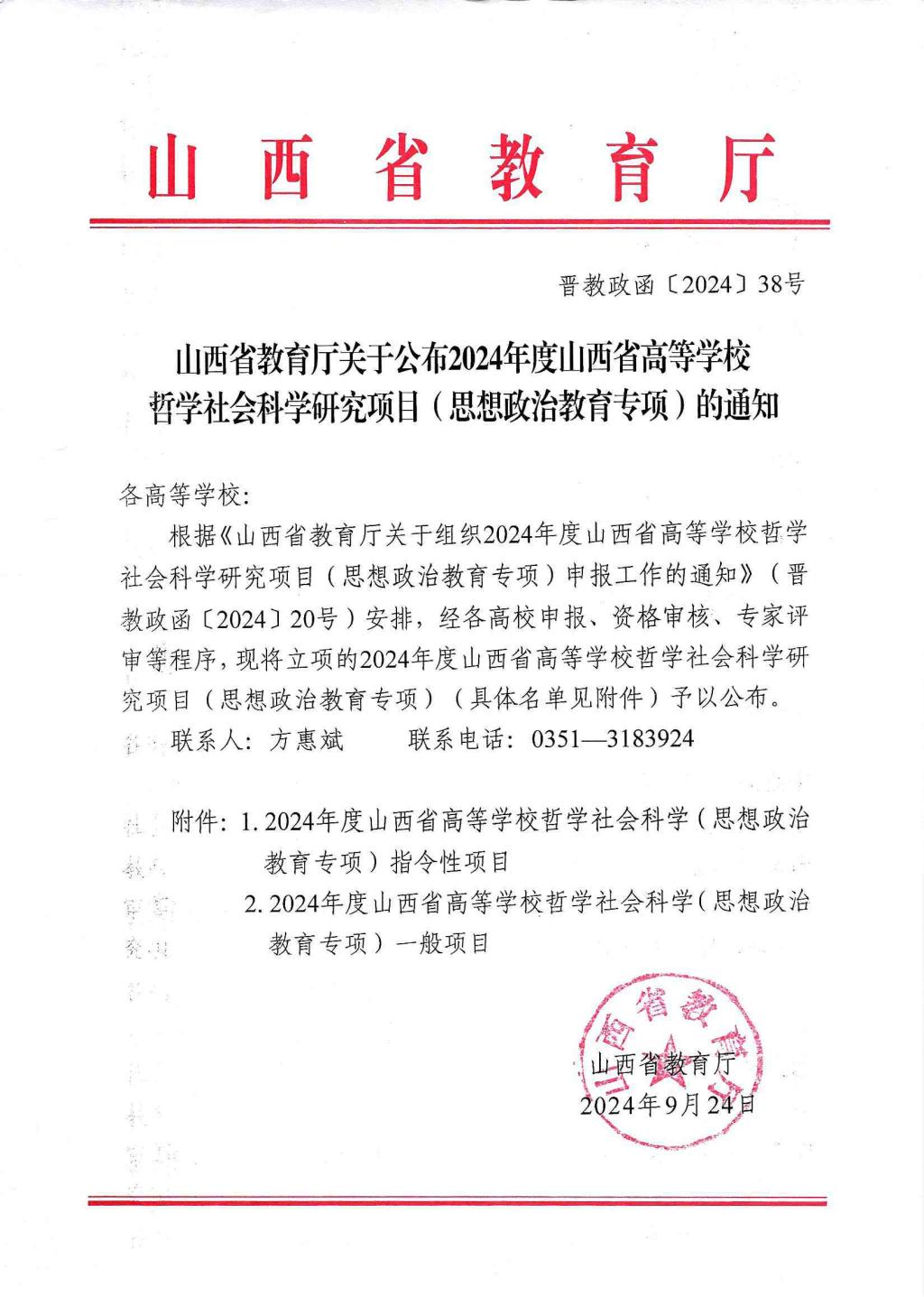 近日,山西省教育厅发布了《山西省教育厅关于公布2024年度山西省高等学校哲学社会科学研究项目(思想政治教育专项)的通知》(晋教政函〔2024〕38号),beat3653项一般项目