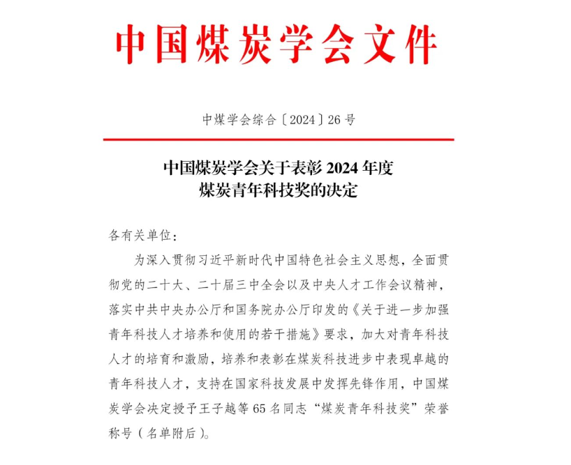 据悉,煤炭青年科技奖经科技部国家科学技术奖励工作办公室批准设立,旨在造就一批进入国内外科技前沿的青年学术和技术带头人,在煤炭工业发展和科技创新中做出突出成就的青年科技人才。经过网络和专家评选、公示等环节,最终65人入选“2024年煤炭青年科技奖”。beat365青年教师摘取该奖项,不仅是中国煤炭学会对beat365青年教师个人科研贡献的认可,也是对beat365青年科研团队建设和科技创新实力的充分肯定,将进一步激发beat365青年科技工作者锚定科技前沿、致力科技创新,为学校高质量发展提供更好人才保障和科研支撑。