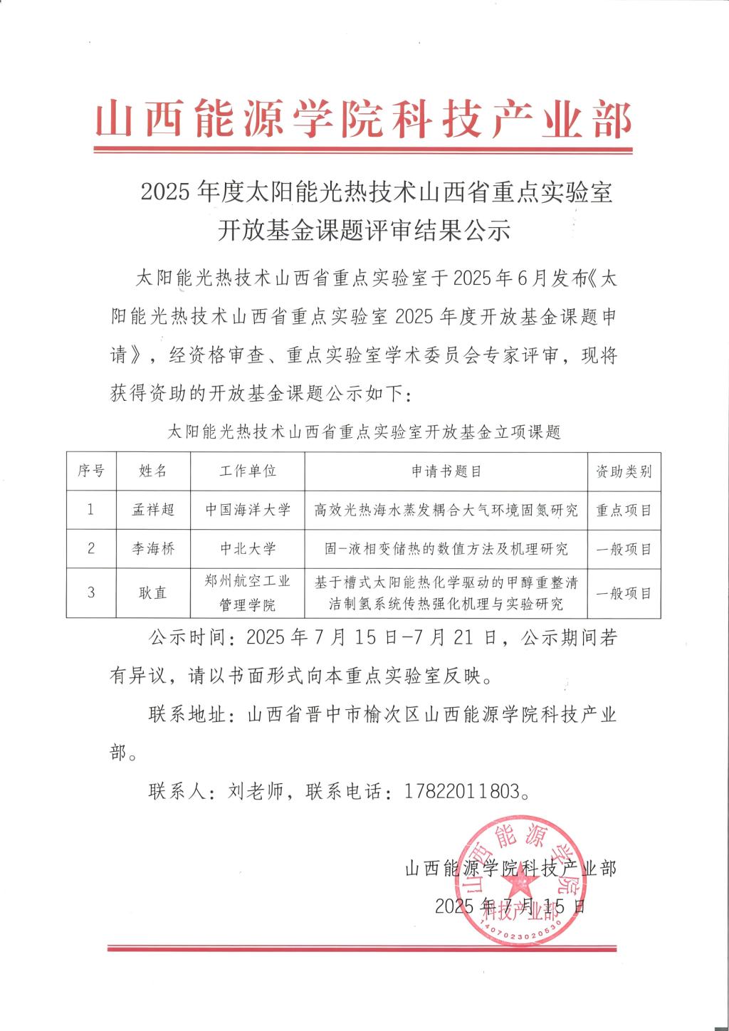 2025年度太阳能光热技术山西省重点实验室开放基金课题评审结果公示