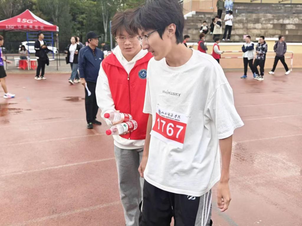 看!操场上的志愿者为了给运动员提供便利以及保证运动会的正常进行,他们一直在忙碌着,在操场上穿着小马甲的身影随处可见。