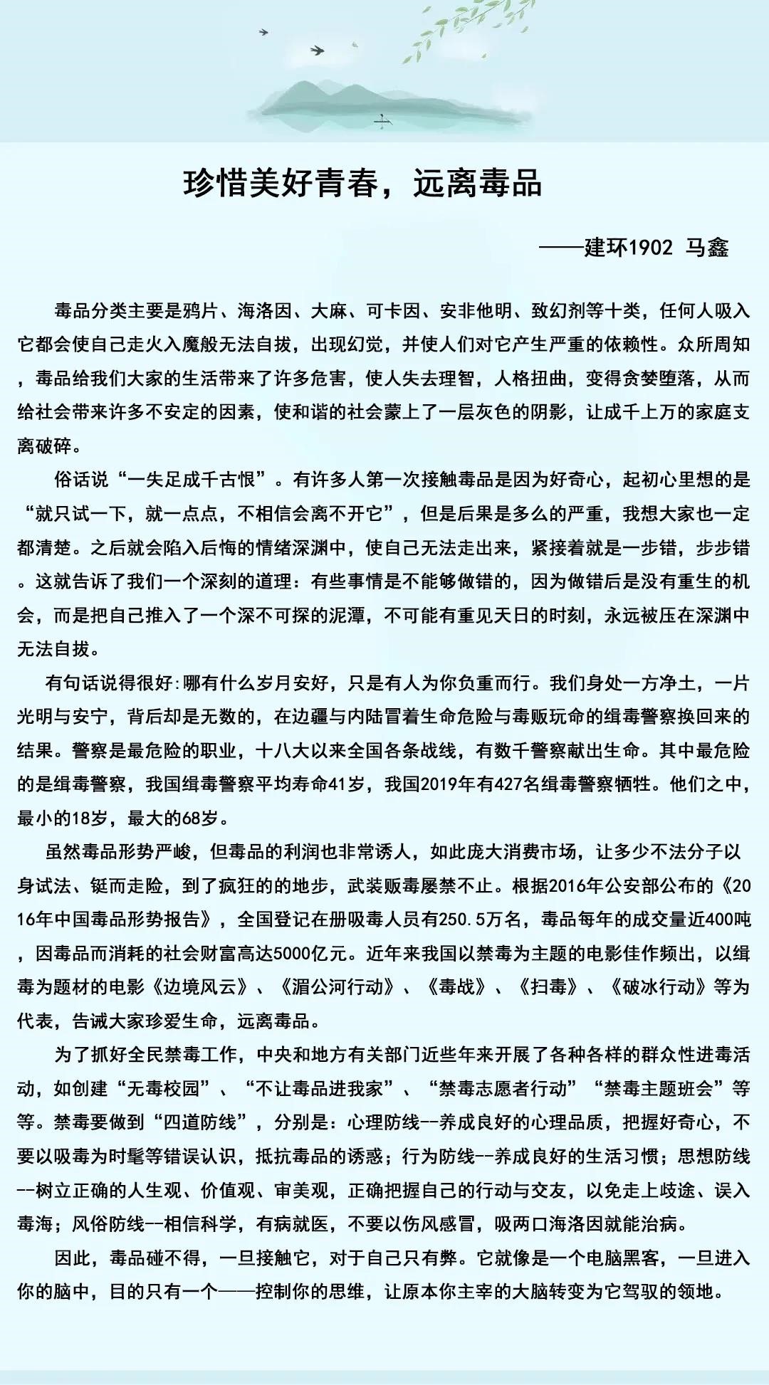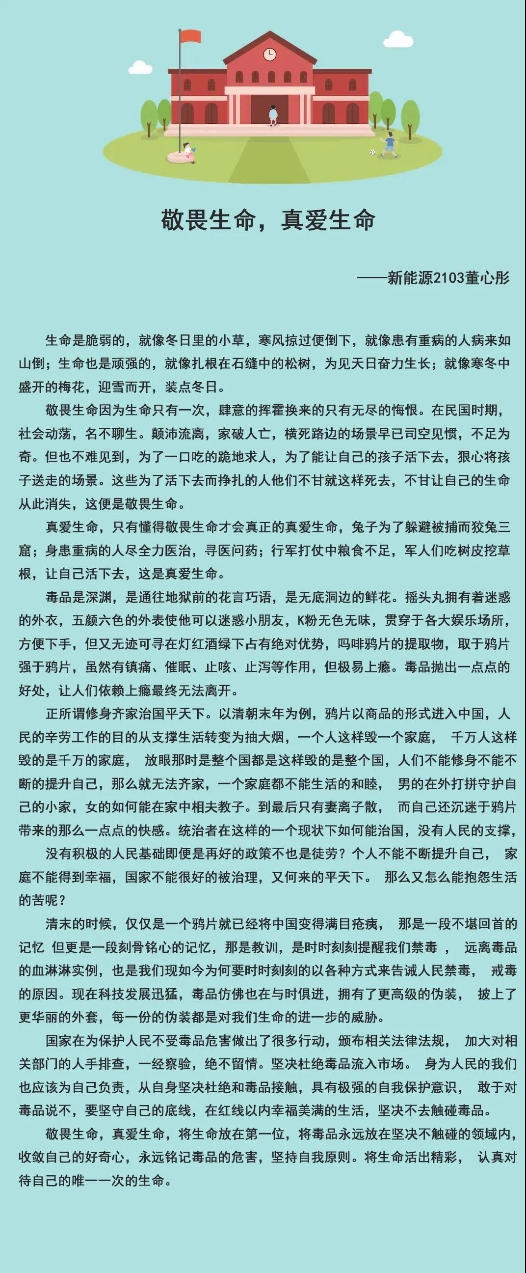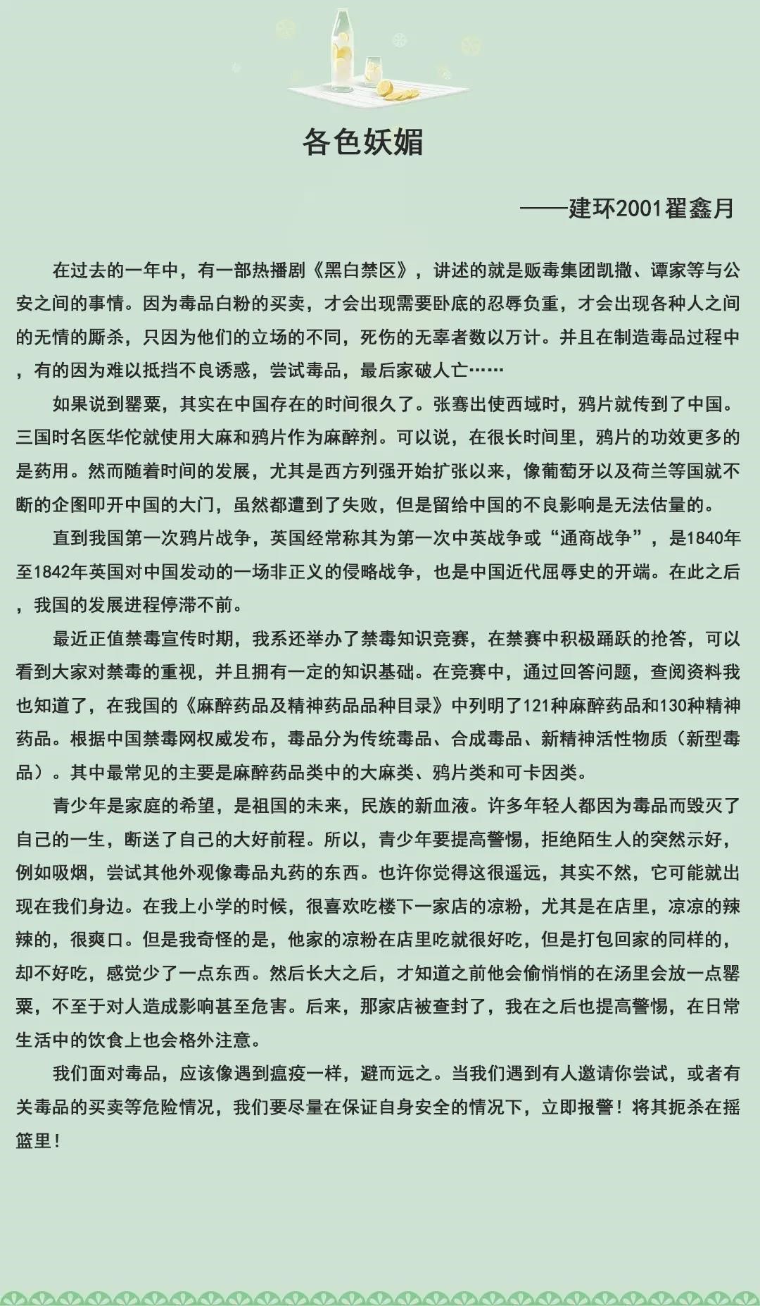 希望通过本次征文活动,能让同学们更加深刻地了解和认识毒品问题的有关知识,深刻认识毒品对个人、对家庭、对社会的巨大危害,同时也希望同学们能增强识毒、拒毒、防毒意识,提高抵御毒品侵蚀能力,享受“绿色无毒,健康人生”。