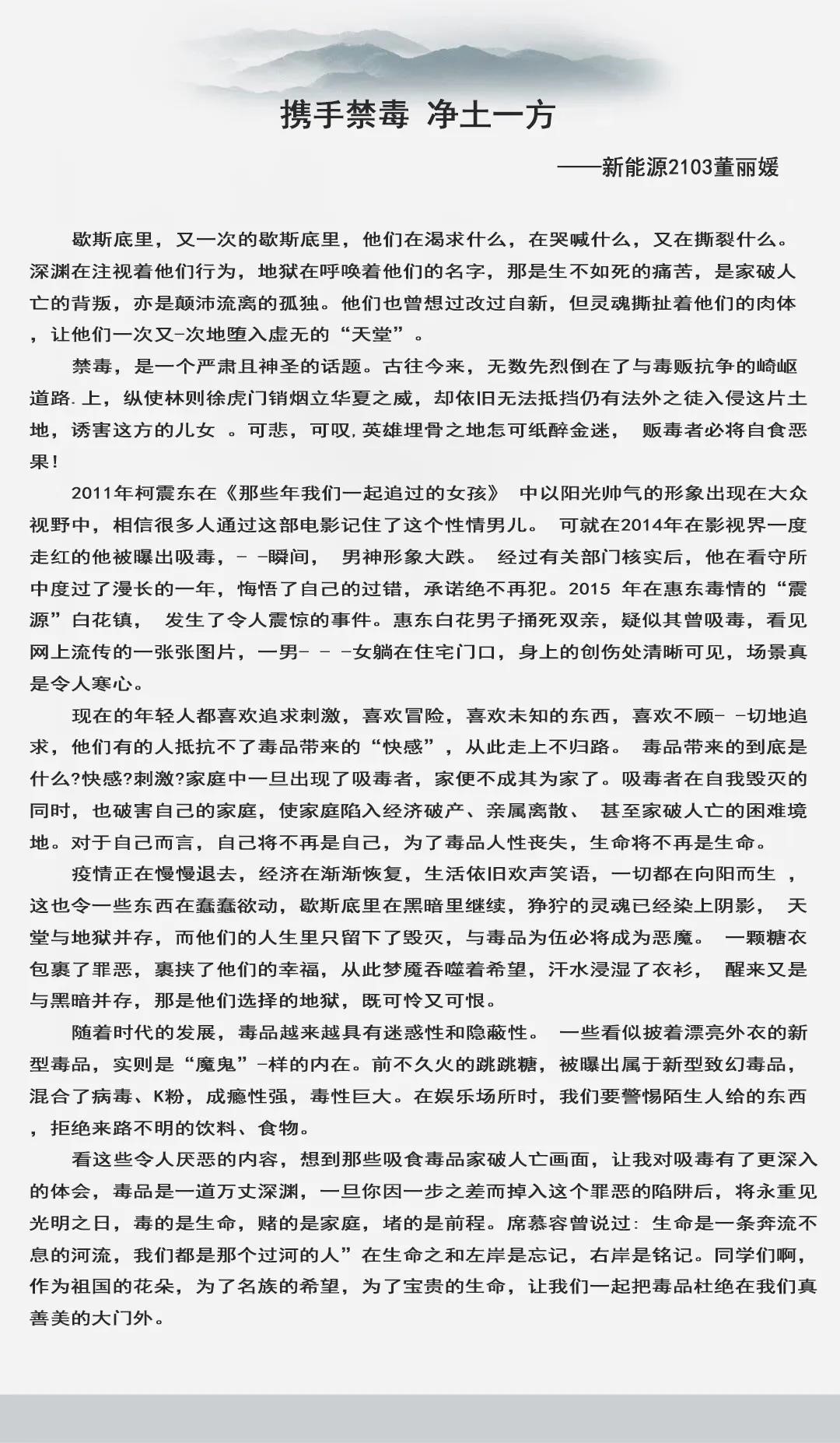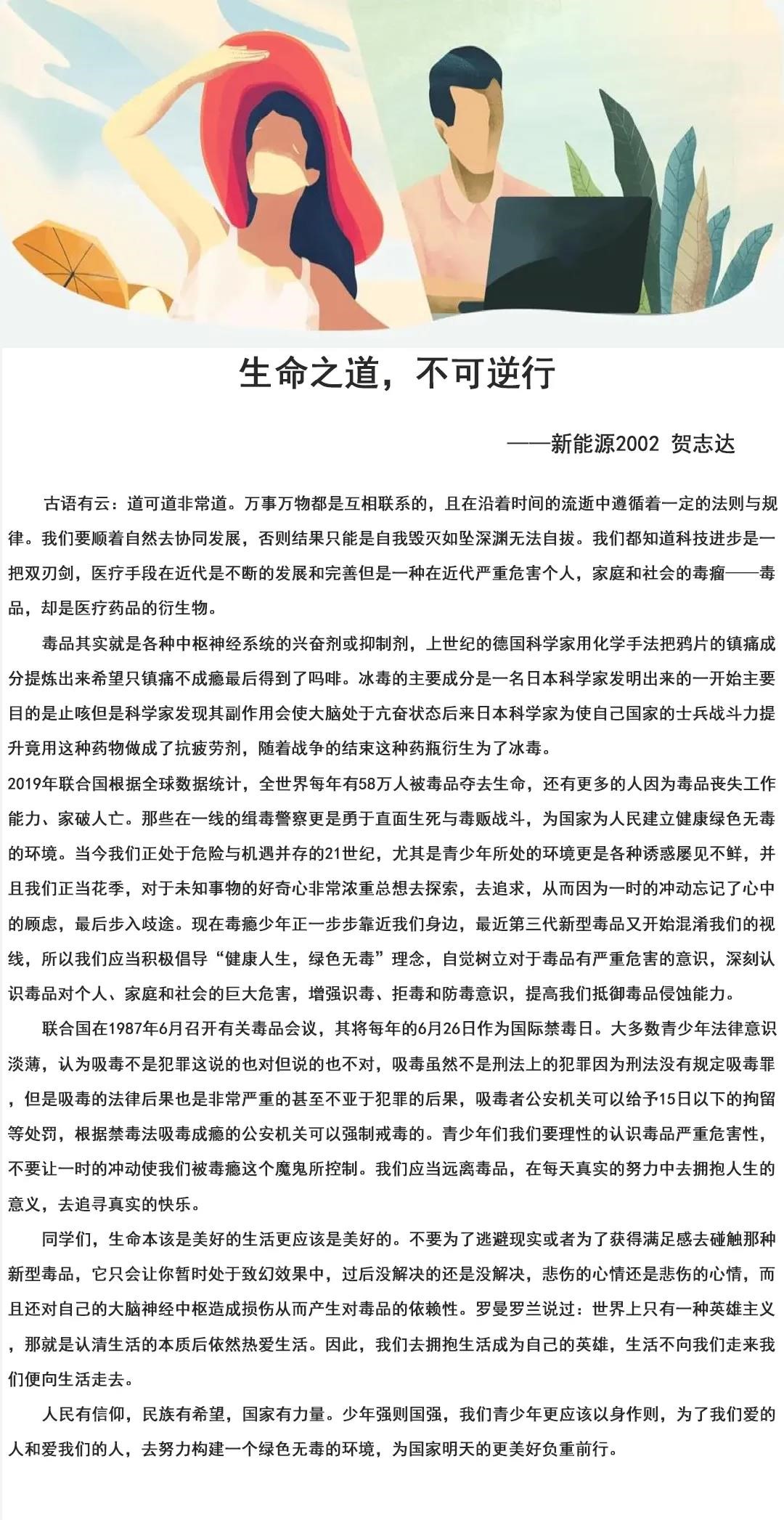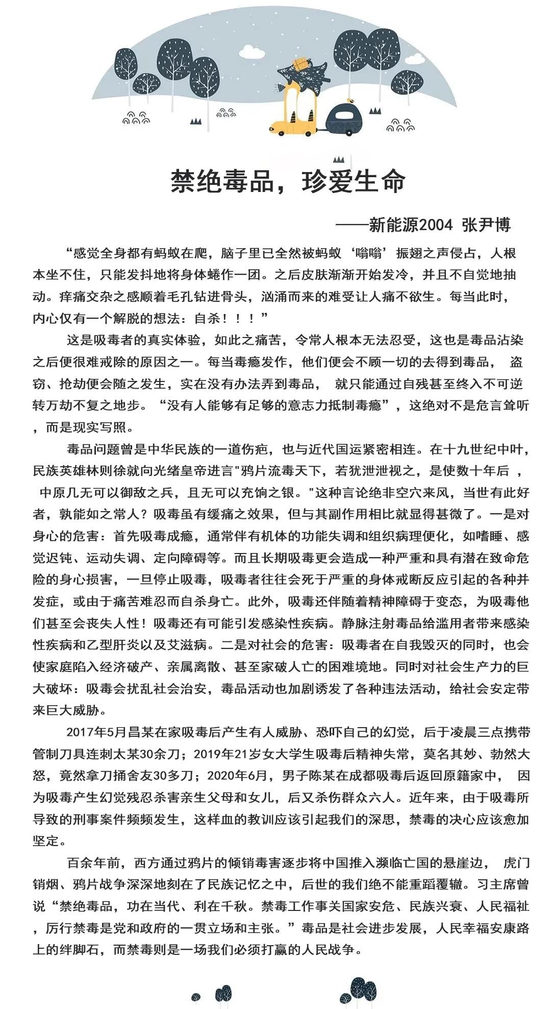 希望通过本次征文活动,能让同学们更加深刻地了解和认识毒品问题的有关知识,深刻认识毒品对个人、对家庭、对社会的巨大危害,同时也希望同学们能增强识毒、拒毒、防毒意识,提高抵御毒品侵蚀能力,享受“绿色无毒,健康人生”。