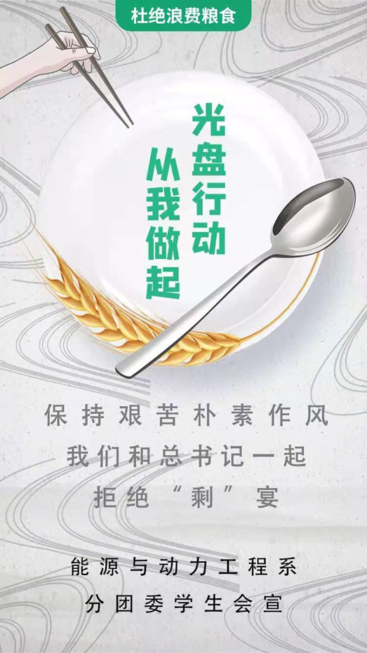 为了弘扬中华民族勤俭节约的优良传统,树立“节约光荣,浪费可耻”的思想观念,同时培养学生勤俭节约、艰苦奋斗的品质,减少舌尖上的浪费,推动校园良好风尚的形成。我系分团委学生会青志部于2020年11月16日至2020年11月22日开展以“勤俭节约,反对浪费”为主题的“光盘”行动。参与本次活动的有beat365英国官网能源与动力工程系全体成员。