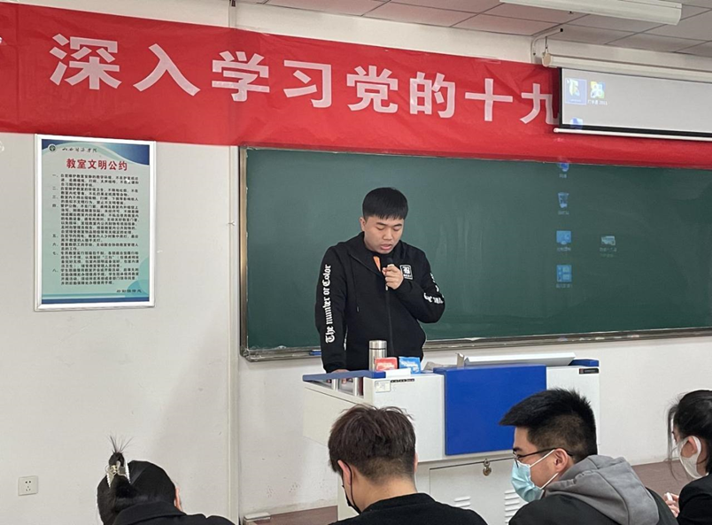 我系学生党支部书记王强同志带领学习党的十九届六中全会精神。王强老师主要从“两个确立”、三个“需要”、三次飞跃、四个伟大成就、五大历史意义、十大历史经验、十三方面的重要成就、全党四个必须、党中央的一个号召来解读《中共中央关于党的百年奋斗重大成就和历史经验的决议》。他强调,党的十九届六中全会是在我们党成立一百年之际,党领导人民实现第一个百年奋斗目标、向着实现第二个百年奋斗目标迈进的重大历史关头召开的一次极为重要的会议。学习贯彻党的十九届六中全会精神是我们全体党员当前和今后一个时期的重大政治任务。