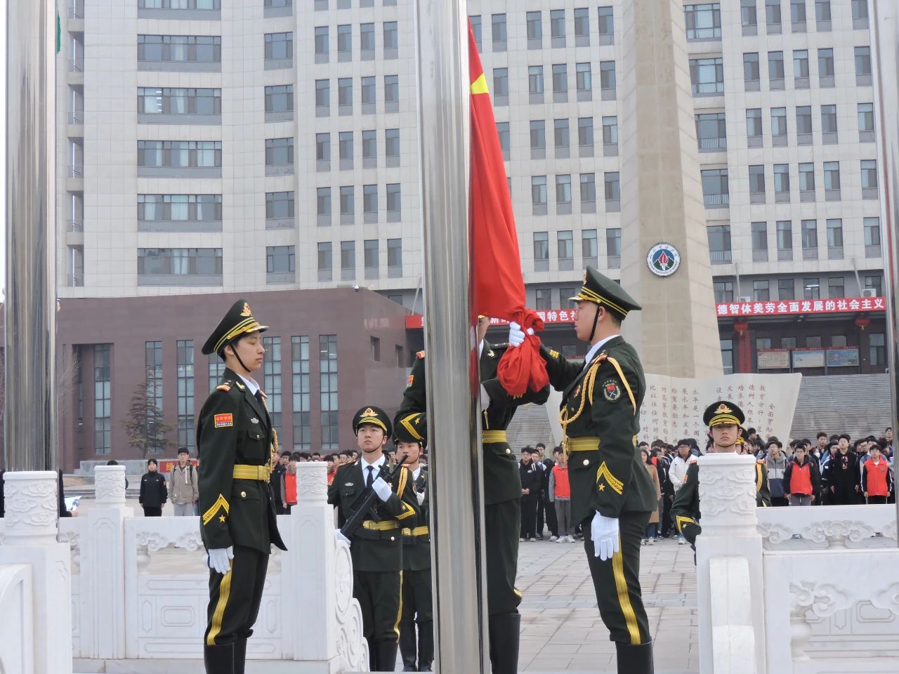 国旗护卫队的旗手们迈着整齐有力的步伐,来到升旗台下。随着“敬礼”的口令发出,擎旗手振臂一挥,将鲜艳的五星红旗向空中一抛,划出一道优美的弧线。展开的五星红旗随风飘扬,在全体师生庄重的注目礼下,如一点红色的太阳冉冉升起。