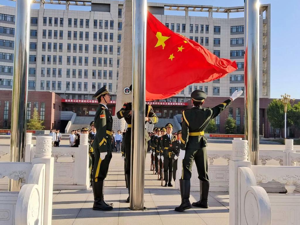 迎着初升的太阳,升旗仪式正式开始。国旗手振臂一挥,国旗随风飘扬,冉冉升起。全体师生行注目礼,那一抹鲜艳的红在阳光下发出耀眼的光芒!