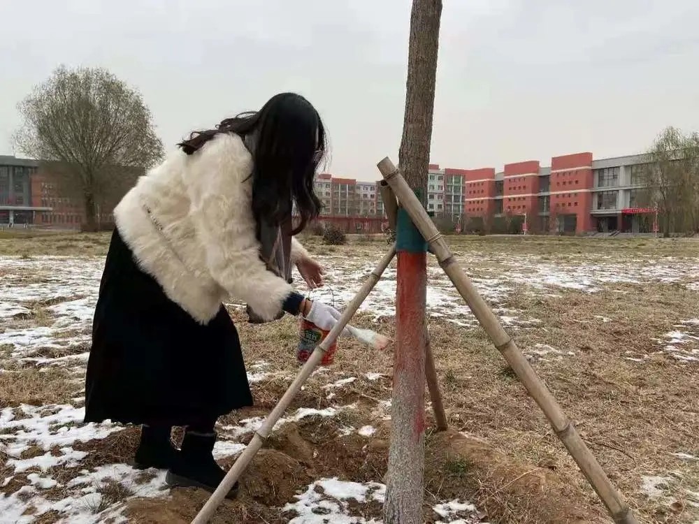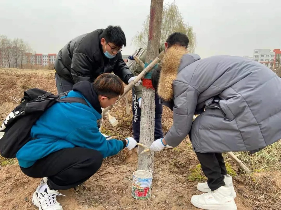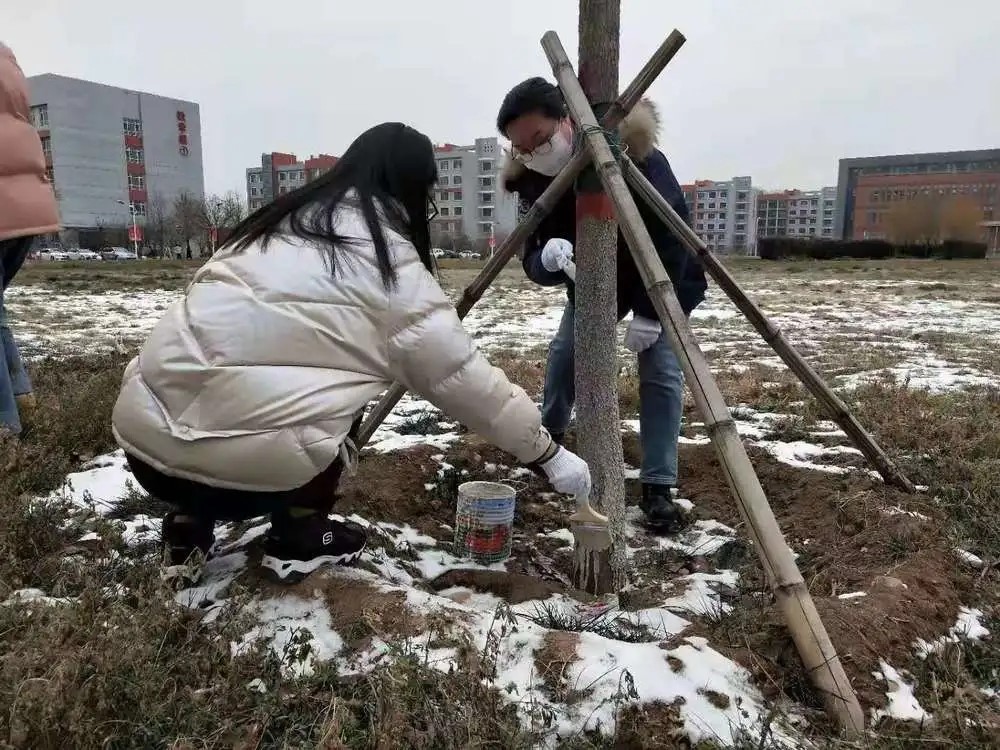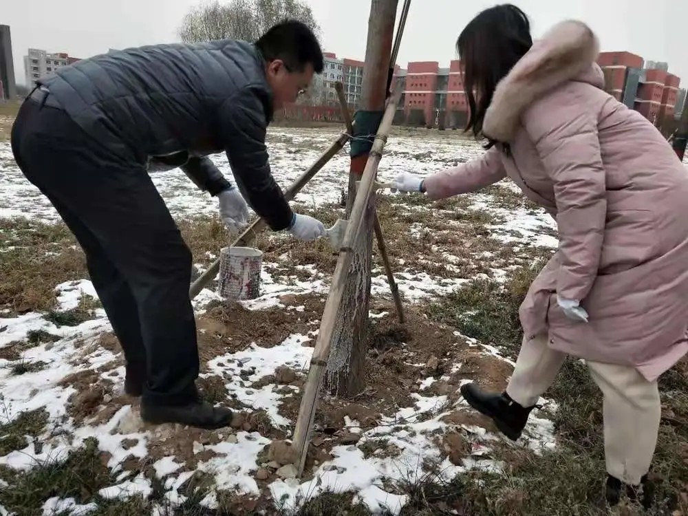 3.各位党员带领预备党员们为校园树木刷漆;