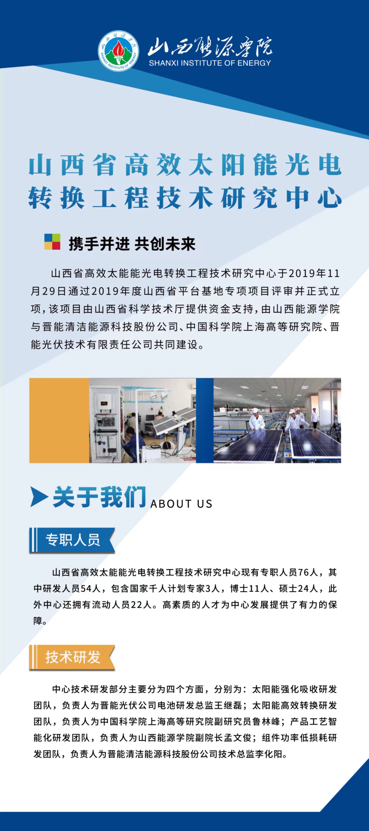 山西省高效太阳能光电转换工程技术研究中心于2019年11月29日通过2019年度山西省平台基地专项项目评审并正式立项,该项目由山西省科学技术厅提供资金支持,由beat365英国官网与晋能清洁能源科技股份公司、中国科学院上海高等研究院、晋能光伏技术有限责任公司共同建设。