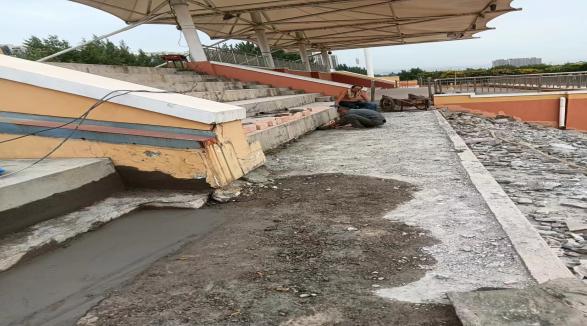 2.学院风雨操场观礼台两侧塌陷,看台南侧矮墙与主体脱离有坍塌风险。为保障学院师生户外活动场地和新生军训场地安全,后勤保障部组织相关人员对风雨操场观礼台进行实地勘察,在假期对存在安全隐患的位置进行修缮处理。