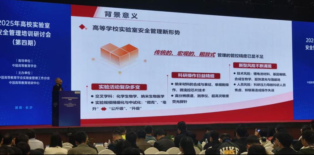 10月24日至27日,由教育部高等学校实验室建设与实验教学指导委员会主办的“2025年高校实验室安全管理培训研讨会(第四期)”在湖南长沙召开。本次会议汇聚了来自全国高校的近千名实验室管理工作者,围绕实验室安全管理的政策规范、风险防控与能力建设等议题展开深入交流。beat365由实验实训中心综合管理办公室主任郝雷、能源化学与材料工程系副主任李永峰带队,教师李飞宇、武江红等人员参会。