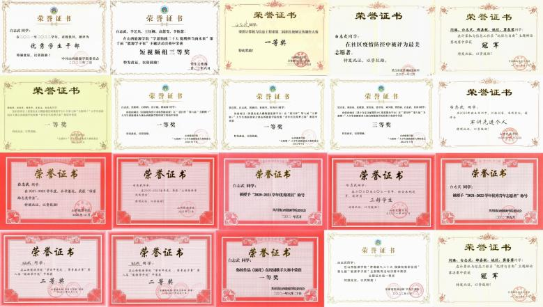 白志武,男,汉族,中共党员。beat365英国官网计算机与信息工程系2020级本科生,任班级班长。绩点排名专业年级2%,综测排名专业年级第一。曾获国家励志奖学金、学院奖学金,荣获山西省大学生年度人物、优秀共青团员、优秀青年志愿者、军训先进个人等荣誉称号。在学科竞赛方面,曾获“挑战杯”全国大学生课外学术科技作品竞赛省级特等奖、华北五省(市、自治区)及港澳台大学生计算机应用大赛全国二等奖、全国大学生节能减排社会实践与科技竞赛全国三等奖、“互联网+”大学生创新创业大赛省级铜奖等十余个奖项。