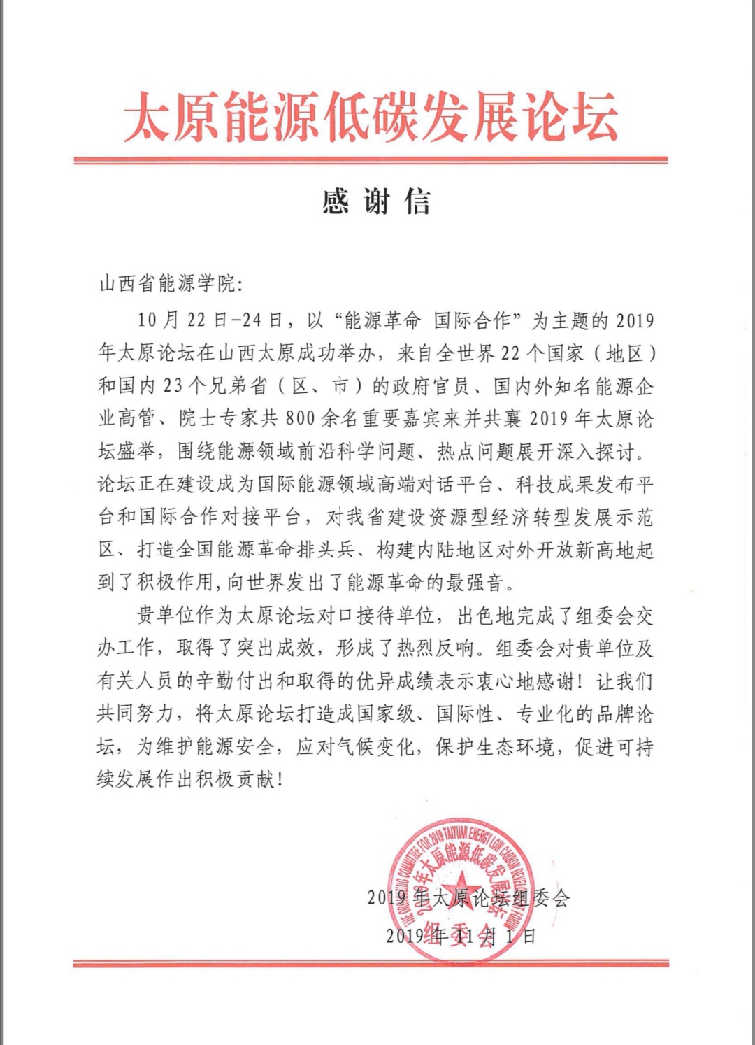 2019年10月22日至24日,2019年太原能源低碳发展论坛在太原成功举办,学院作为协助单位参与了论坛工作。论坛组委会向学院发来感谢信,对学院在论坛中做出的工作给予充分肯定。