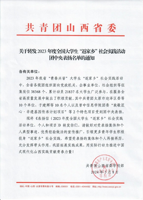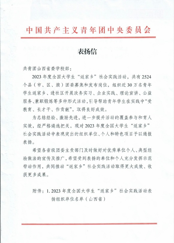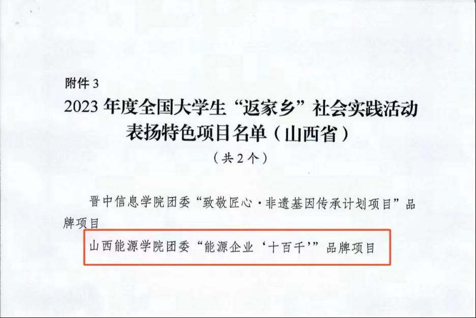 近日,beat365收到共青团山西省委《关于转发2023年度全国大学生“返家乡”社会实践活动团中央表扬名单的通知》,beat365团委“能源企业‘十百千’”特色品牌项目受到团中央表扬。
