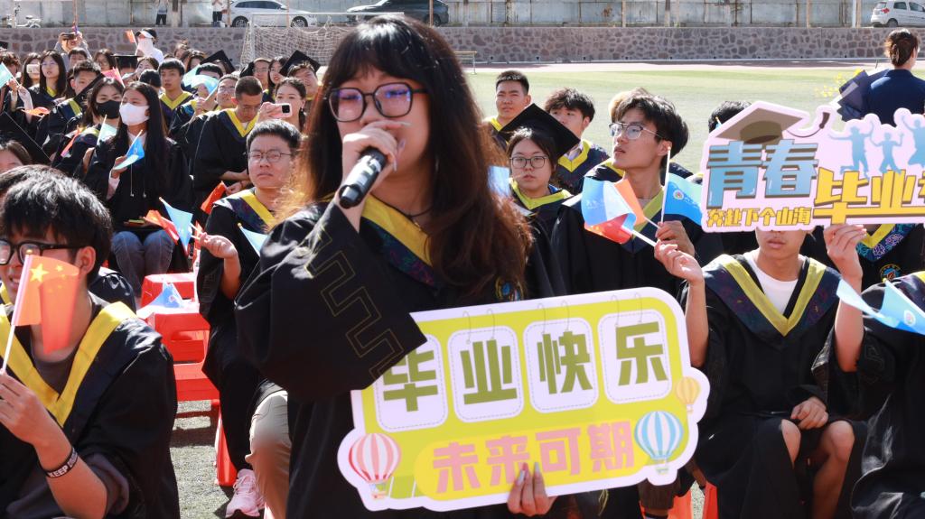 毕业生代表手持鲜花向学校保卫、教务、后勤等多部门基层教职工致敬感谢,并用深情的歌曲表达对学校、师长及同窗的感激之情和对未来的美好憧憬。