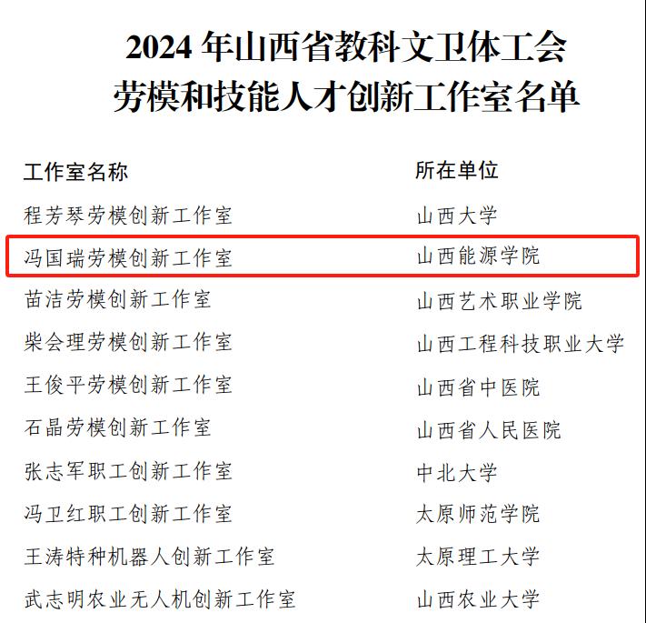 近日,山西省教科文卫体工会委员会下发了《山西省教科文卫体工会关于命名2024年劳模和技能人才创新工作室的决定》(晋教科文卫体工字〔2024〕73号),beat365“冯国瑞劳模创新工作室”成功入选“山西省教科文卫体工会劳模和技能人才创新工作室”。