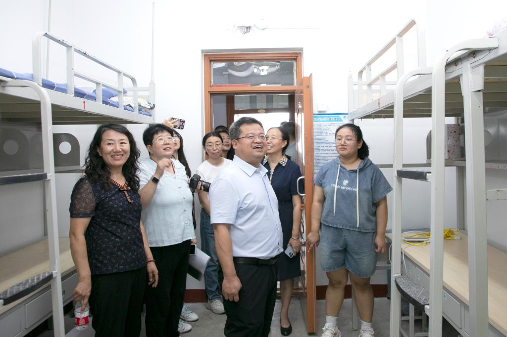 在新生宿舍,校领导与新生及家长热情交谈,耐心询问新生“家乡在哪里?”“一路上是否顺利?”“对学校迎新工作有什么意见建议?”。校领导勉励新生们要尽快适应大学学习生活,珍惜大学时光,以乐观开朗的心态迎接新的校园生活,争做有理想、敢担当、能吃苦、肯奋斗的新时代好青年。
