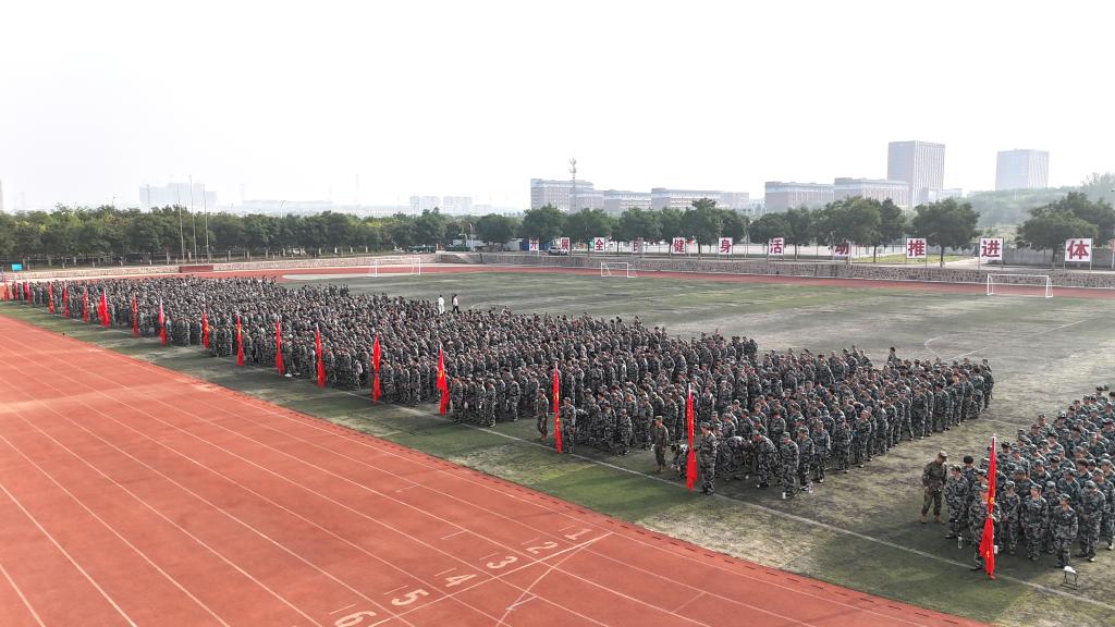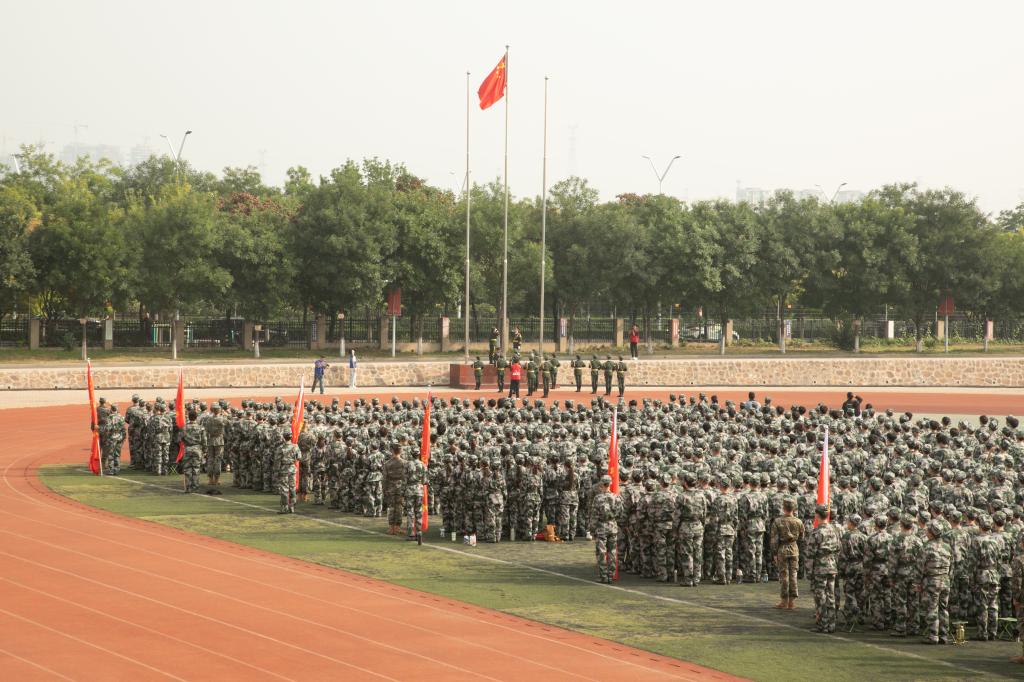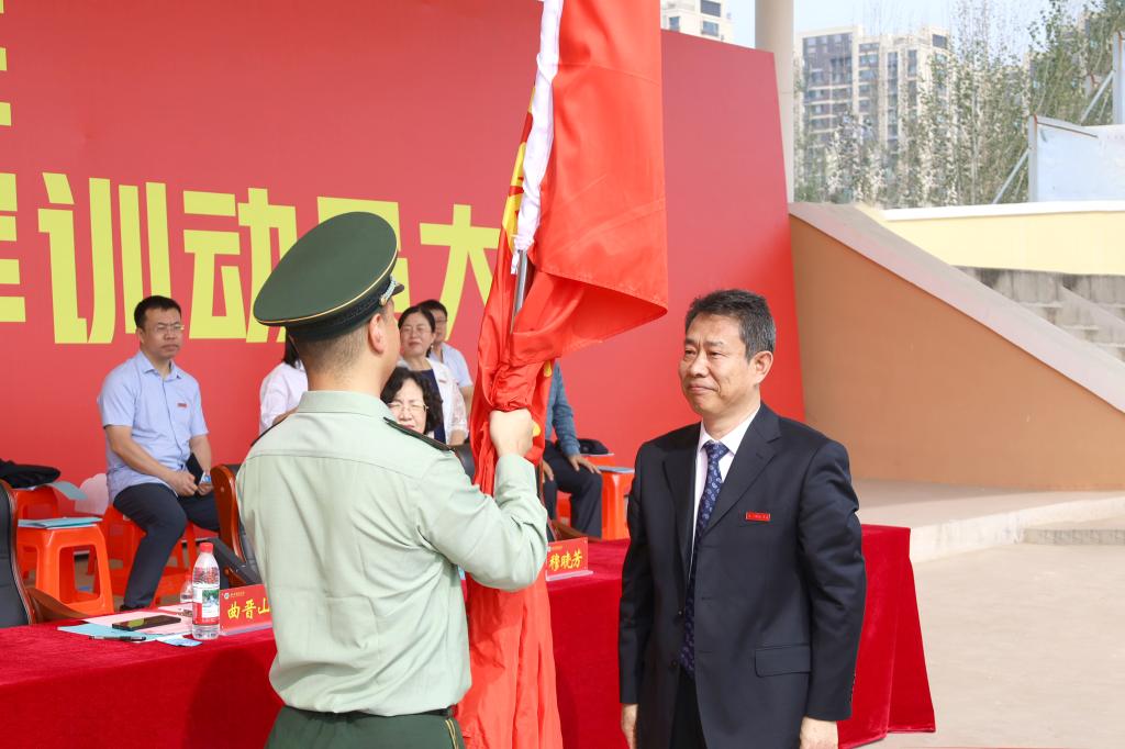 校党委副书记曲晋山向承训总教官授军训团团旗并作军训动员。他强调,军训正是让新生近距离感受中国军人精神的契机,希望通过训练,增强新生的国防意识和爱国精神,明白青年与祖国的紧密联系。他要求新生在军训中做到守纪律、讲规矩、听指挥、有担当,团结互助、相互配合,认真完成本次军训的各项任务。将军训中锤炼的品格融入到未来的大学生活中,转化为未来探索知识、追逐梦想的动力,成长为有理想、敢吃苦、肯奋斗的新时代青年。