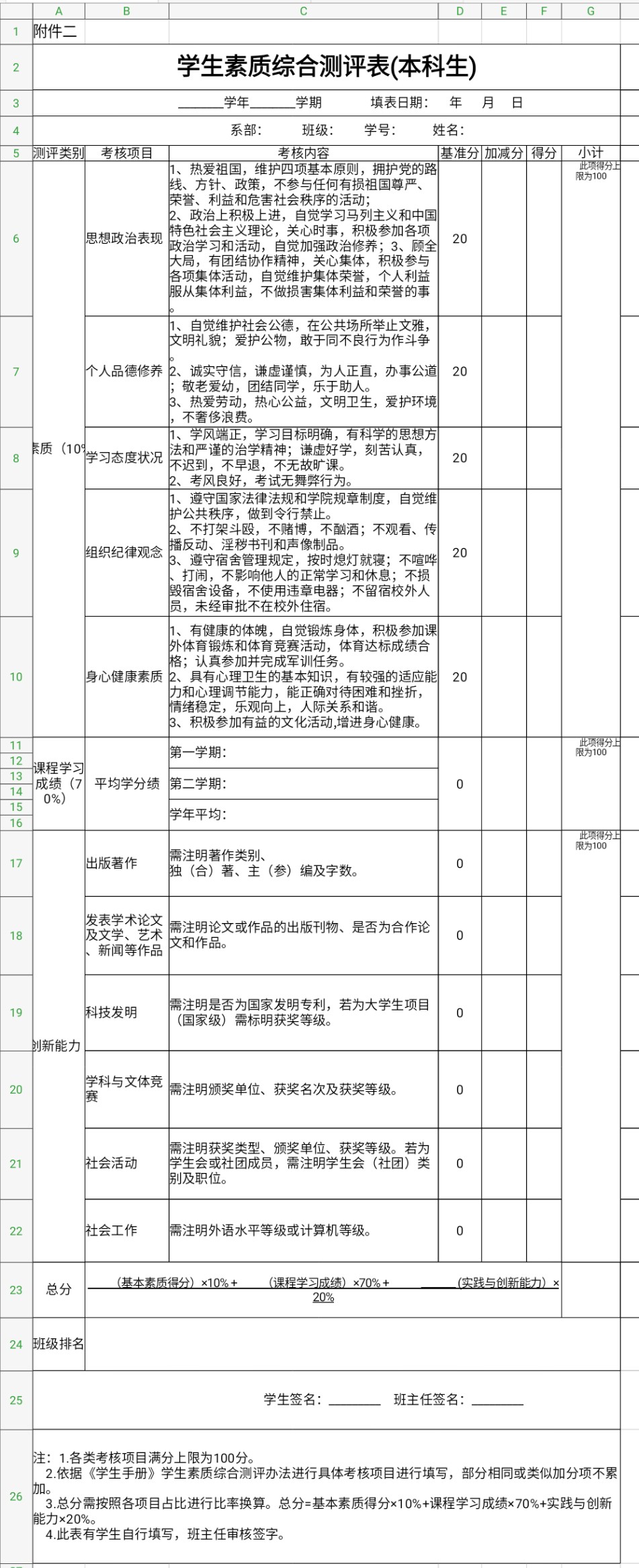 为引导学生全面提升综合素质切实做好我院学生素质综合测评工作,提高工作效率,学生工作部(处)根据《学生手册》中《学生素质综合测评办法》的相关规定制作了学生素质综合测评表。现将学生素质综合测评说明(附件一)、本科学生素质综合测评表(附件二)、专科学生素质综合测评(附件三)发给大家。