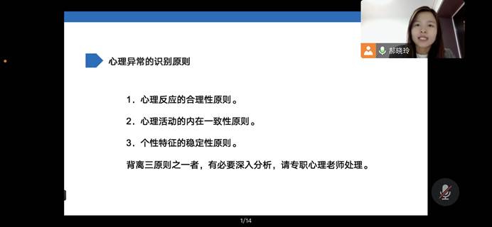 本次培训,心理老师们就“为什么需要心理委员”,“心理委员可以做什么”向同学做了宣传与介绍,并指出心理委员是心理健康教育的基础,是覆盖面最广的一环,也是学生心理健康状态“瞭望者”,如果能掌握相关知识、基本助人技巧,就能在学生心理危机干预以及心理健康教育宣传上发挥巨大作用。讲座中,心理老师们对了心理委员的工作提出了期望,希望他们及时了解学生心理动态,同时进行朋辈互助,带动学生自我关怀和关怀他人,并将心理教育相关资讯传递到各个班级,更好的促进心理健康教育全覆盖。